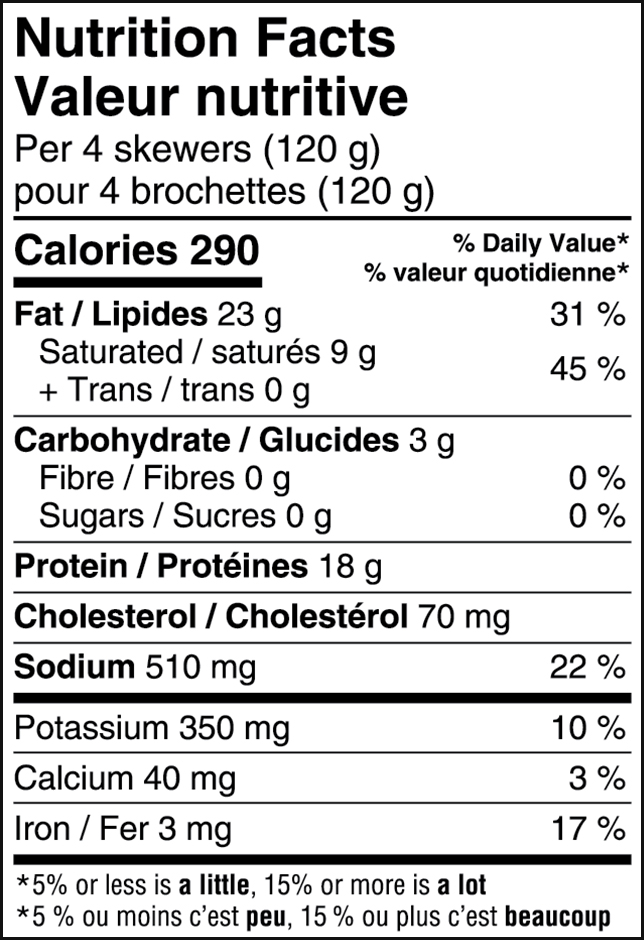 Lamb • Water • Seasoning (spices, onion powder, canola oil) • Soy sauce (water, soy, alcohol) • Seasoned oil (canola oil, paprika extract, onion extract, spice extract) • Salt • Spice • Corn starch • Seasoning (tapioca dextrin, grill flavour, potato maltodextrin, smoke flavour) • Flavour